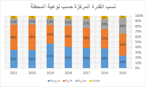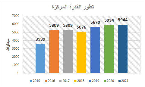 وخلال الفترة الممتدة بين 2010 و2021، تطورت القدرة المركزة لتوليد الكهرباء بحوالي 5% سنويا لتمر من 3599 ميغاوات سنة 2010 إلى 5944 ميغاوات سنة 2021، أي بتركيز 213 ميغاواط سنويا، وهي تتوزع كما يلي:
