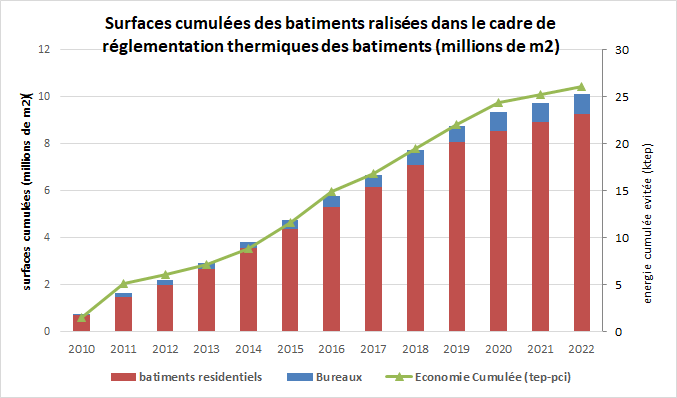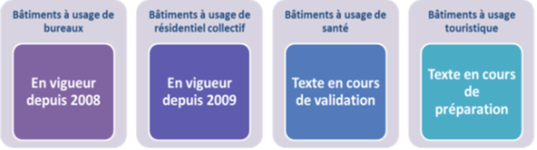 La règlementation thermique est appliquée bâtiments à usage de bureaux et aux bâtiments à usage résidentiel depuis 2008. Des textes ont été élaborés pour les bâtiments destinés aux activités touristiques et pour les bâtiments destinés à la santé non encore publiés.