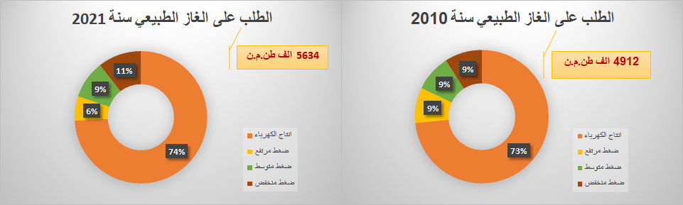 بلغ الطلب من الغاز الطبيعي في سنة 2021، 5634 ألف ط م ن مقابل 4912 ألف طن م ن سنة 2010. وهي تتوزع كالآتي: