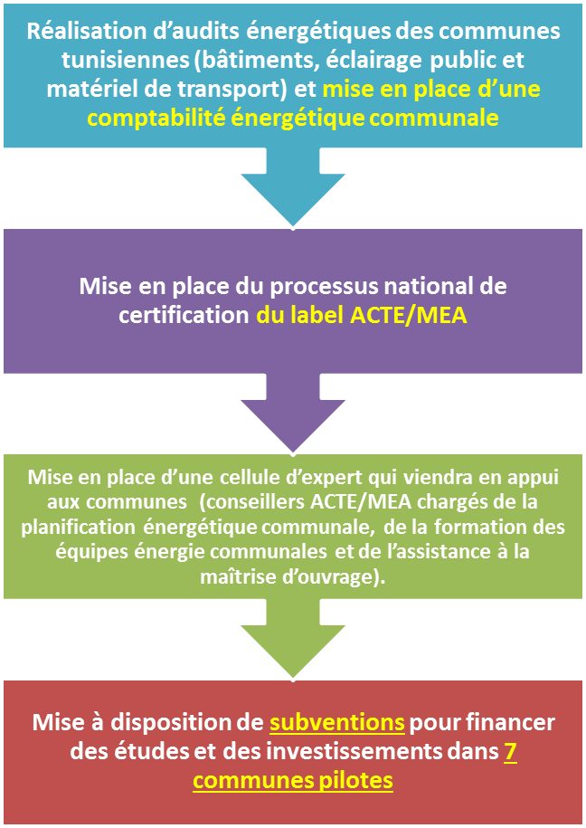 Le programme ACTE, lancé le 27 mai 2015 dans le cadre d’un partenariat entre l'ANME, la Caisse des Prêts et de Soutien des Collectivités Locales (CPSCL) et la Direction Générale des Collectivités Publiques et Locales (DGCPL) vise à renforcer la capacité des municipalités tunisiennes à contribuer à leur niveau à la transition énergétique nationale, par l'exploitation des gisements d'efficacité énergétique et le recours aux énergies renouvelables.
