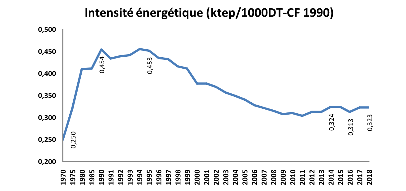 Cet effort déployé par l’Etat tunisien depuis les années 80 a aboutit en conséquence à un découplage entre la consommation énergétique et la croissance économique ainsi qu’une baisse considérable de l’intensité énergétique du pays en passant de 0,454tep/1000DT en 1990 à 0,313tep/1000DT en 2010 avec une légère stagnation depuis 2011 qui s’explique par les conditions économiques post-révolution.